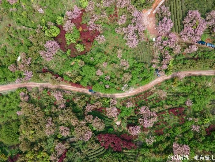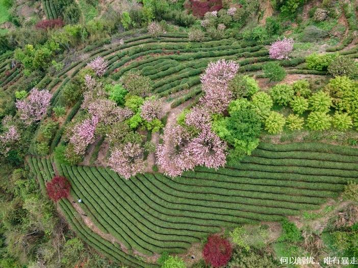 亮点2:晚樱&火焰山:4月晨雾中樱花与梯田茶园层叠,茶香花韵相伴。探秘丁家畈村火焰山,红枫赤岩,鸟瞰如巨型心脏,景致独特!