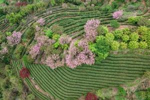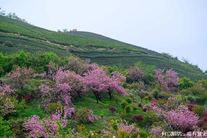 晨雾中粉白花海与梯田茶园层叠如画‌。