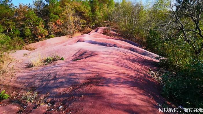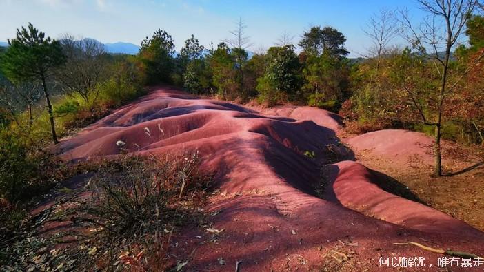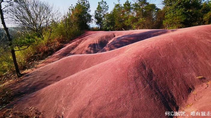 吃饱喝足之后继续前行,穿越茶园抵达樱花岗,一条运送花木的乡间小路成为了最好的赏樱道,左右两山坡上种满了樱花,加之视野开阔,绝对是赏花的最佳地点。随后经姚江源,到达火焰山,这里满地红色,寸草不生,拍照结束后大家顺着山坡环线回程。