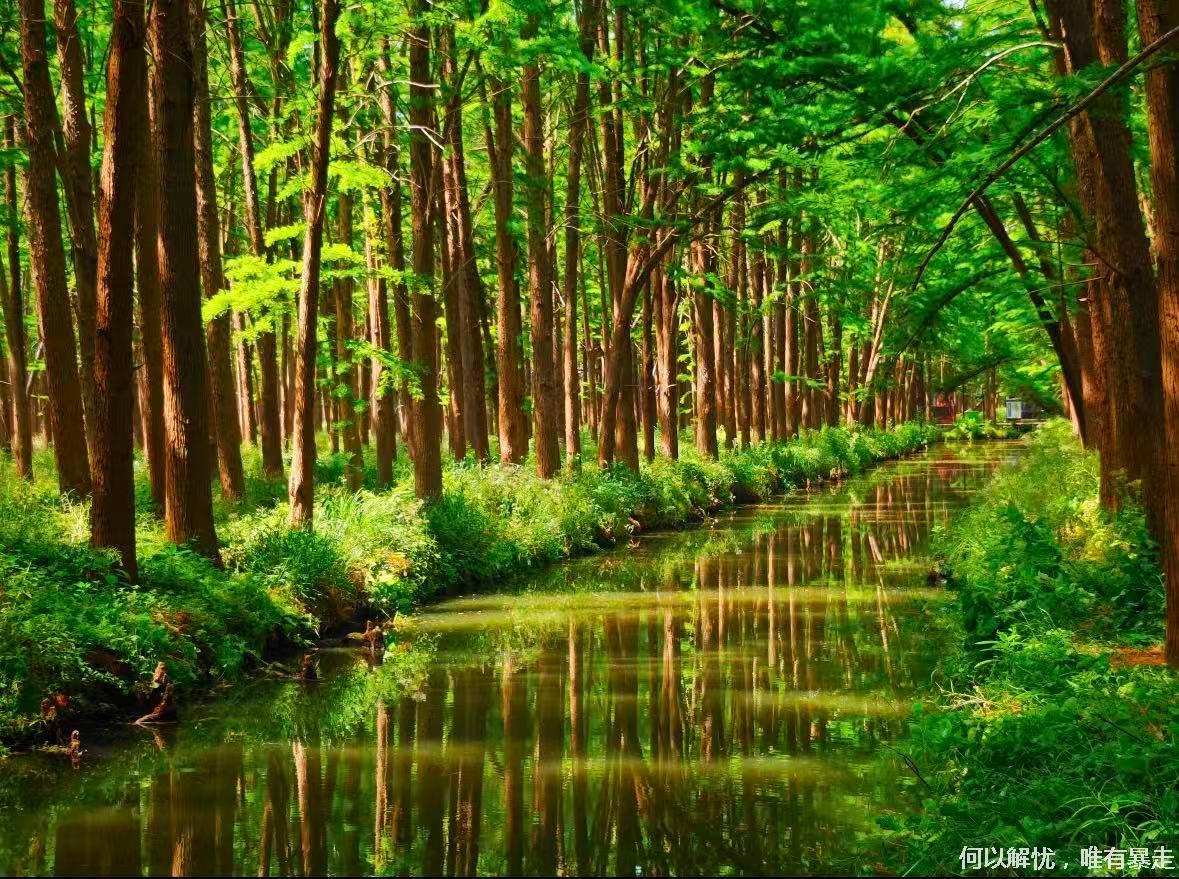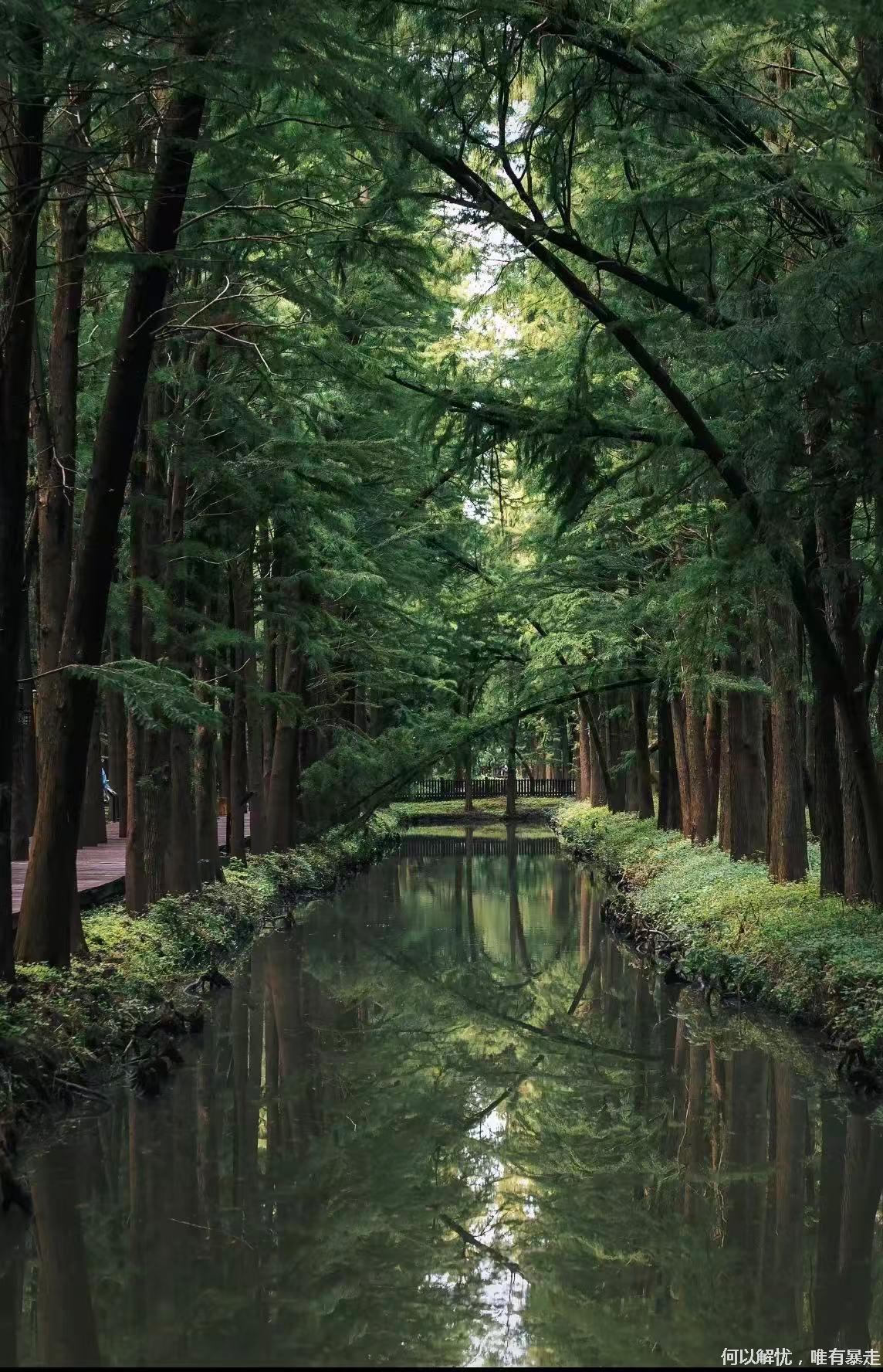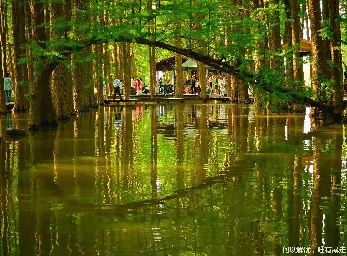 13:30左右,我们前往李中水上森林公园,上世纪80年代初人工改造荒滩,采用林垛沟鱼立体模式,栽10万余株水杉、池杉,形成“林中有水、水中有林”的湿地森林;有好汉林、板桥栈道、雾森秘境等看