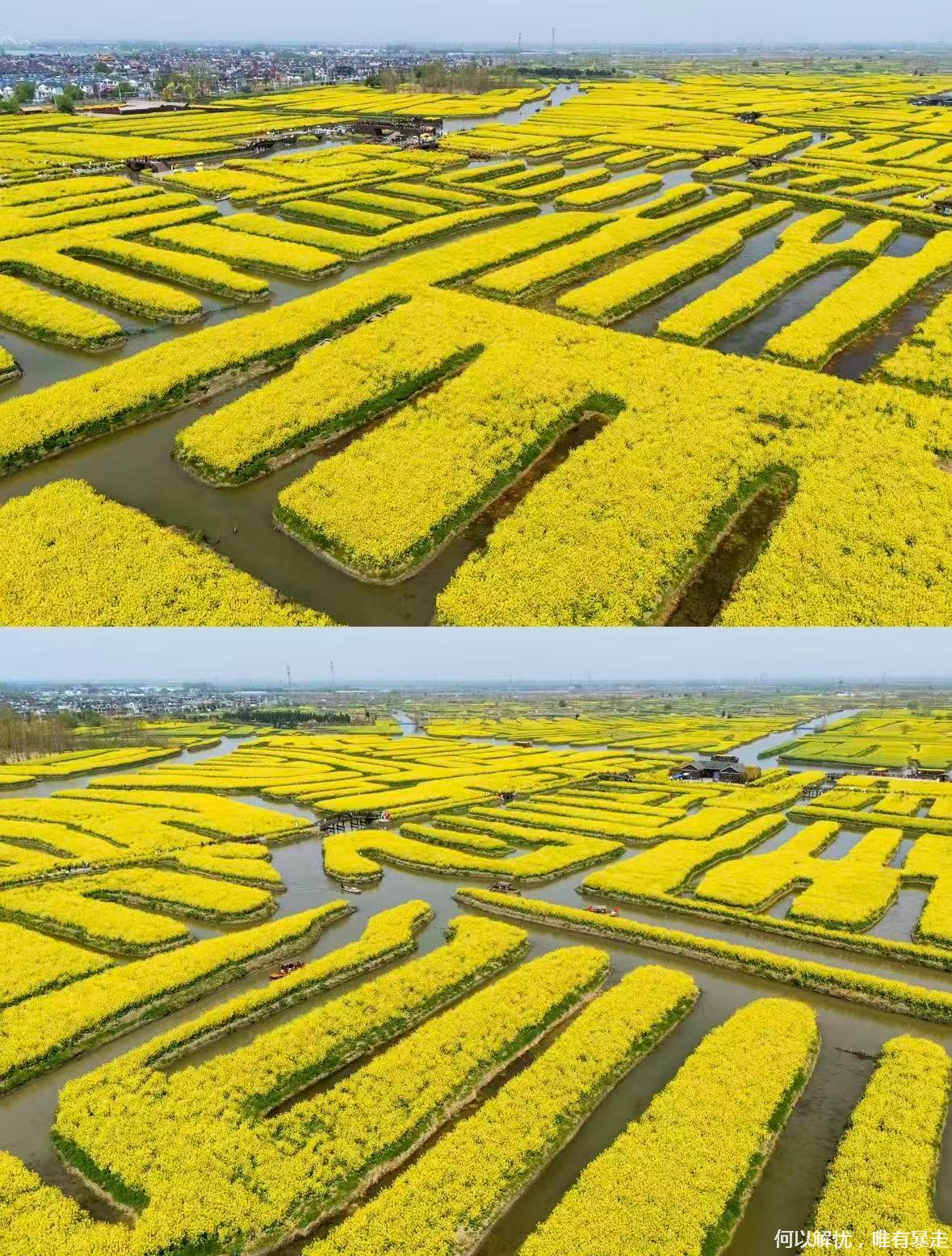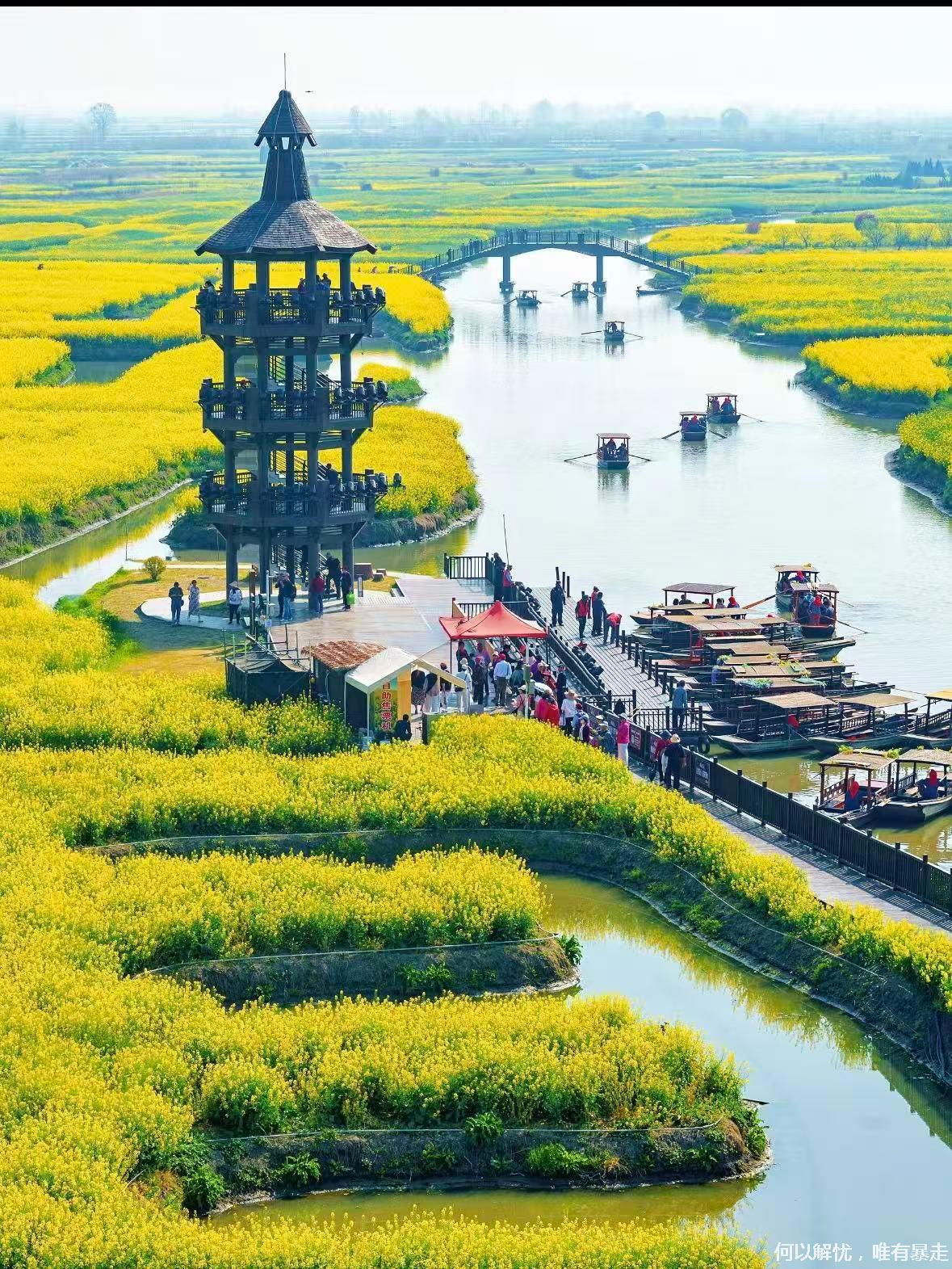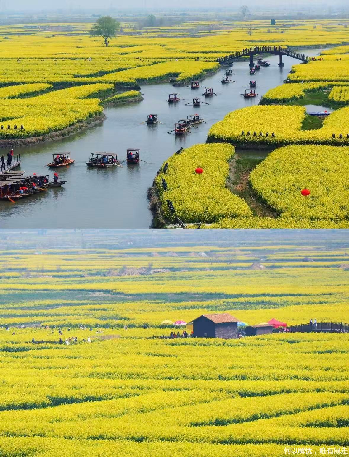 09:00我们到达 千垛油菜花,上千个垛田上金黄的油菜花竞相绽放,与蓝天、碧水相互映衬,形成“河有万湾多碧水,田无一垛不黄花”的绝美画卷。可自费坐乌篷船/画舫穿行垛田水道;登观景台俯瞰金色几何田园