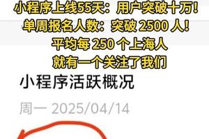 喜讯!小程序上线55天用户突破十万! 单周报名人数突破 2500 人!平均每 250 个上海人就有一个关注了我们 [复制链接]