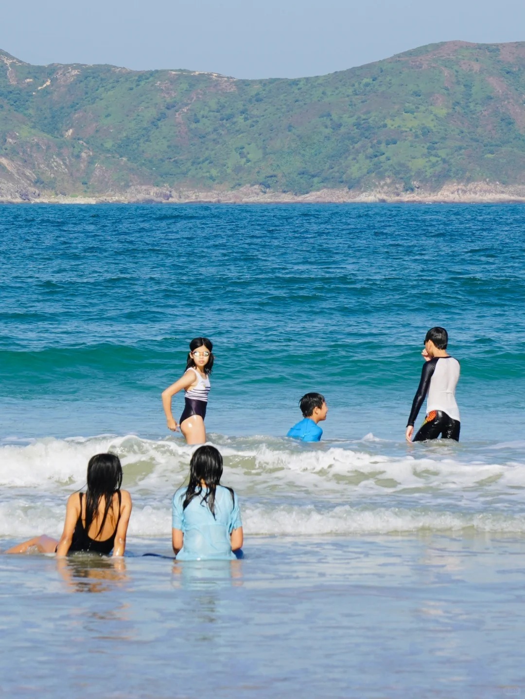 这里水清沙幼,于群山之中,被喻为“西贡半岛的明珠”西湾沙滩中央位置有一石排,将沙滩分成左右两滩,浪接浪接续而来,极目海天接成一线,海风不止,阳光灿烂。