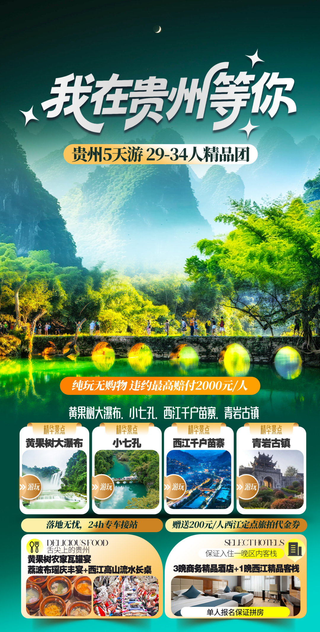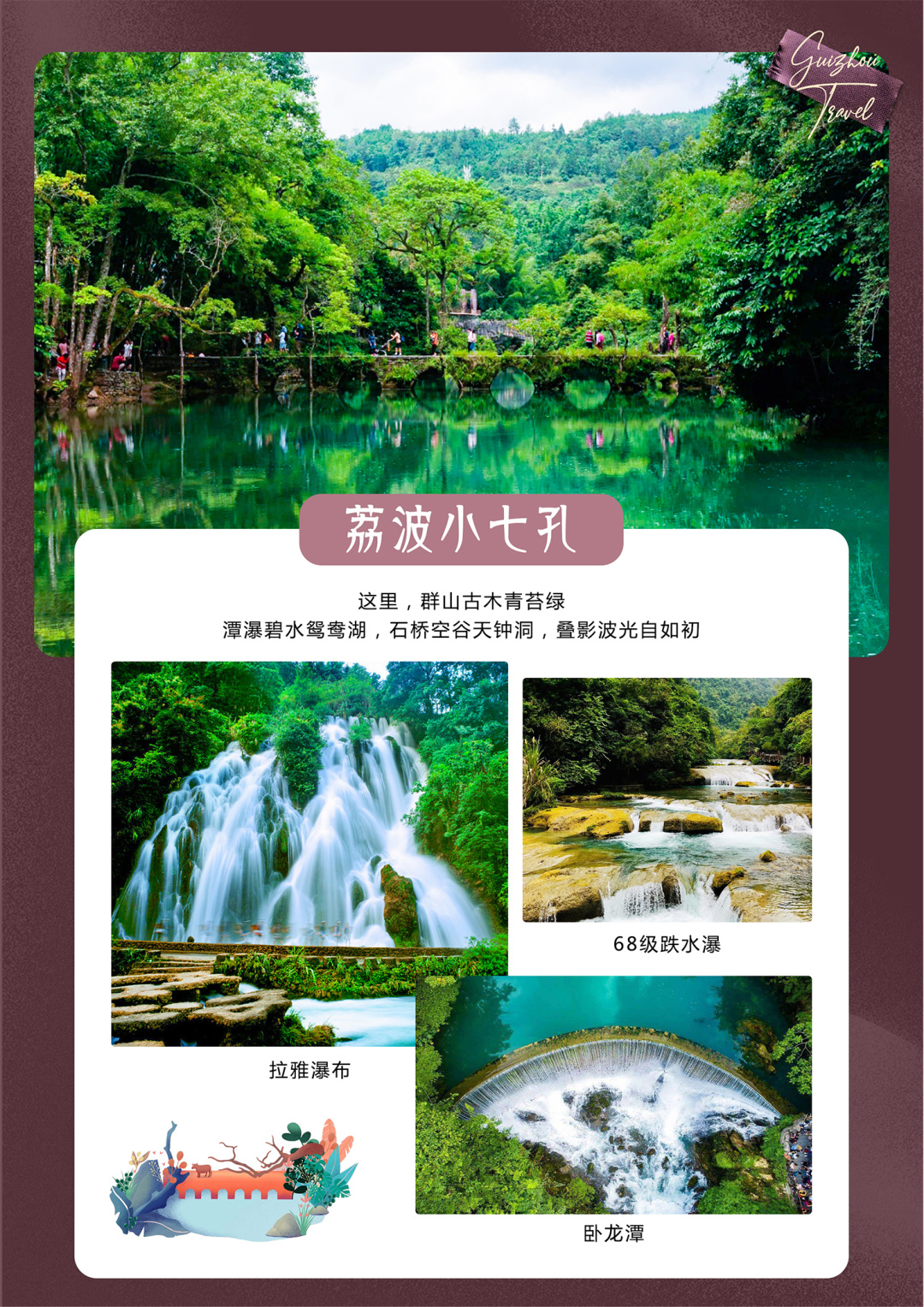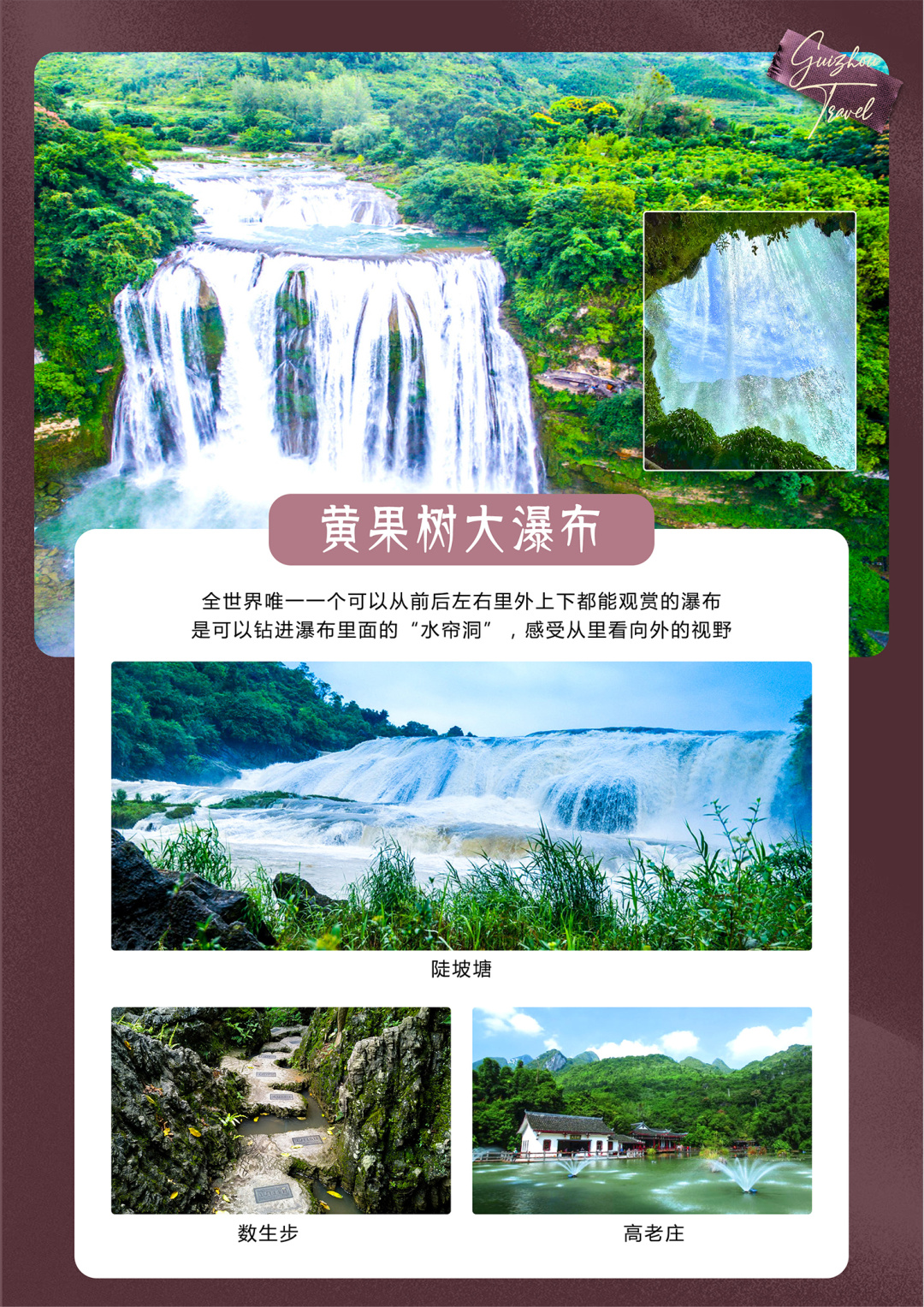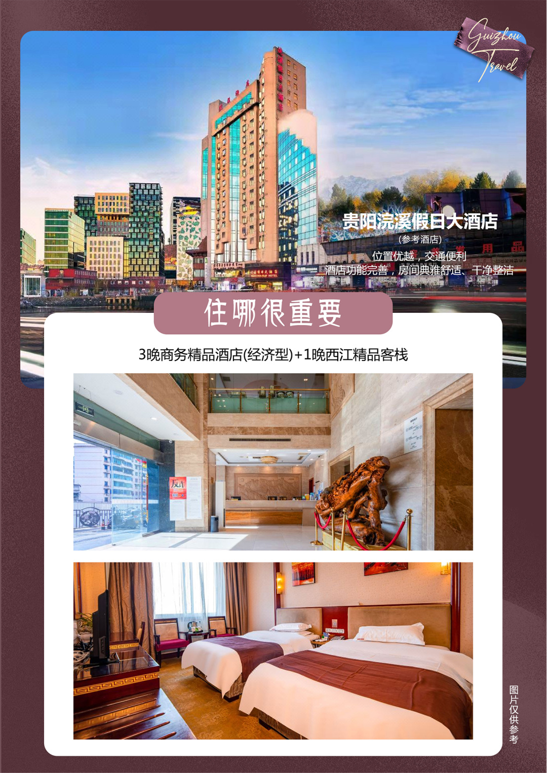 2. 不含景区必消小交通:黄果树大瀑布观光车50元/人+保险10元/人、小七孔观光车40元/人+保险10元/人、西江4程观光车20元/人+保险10元/人,青岩观光车25元/人,费用需自理。总合计:165元