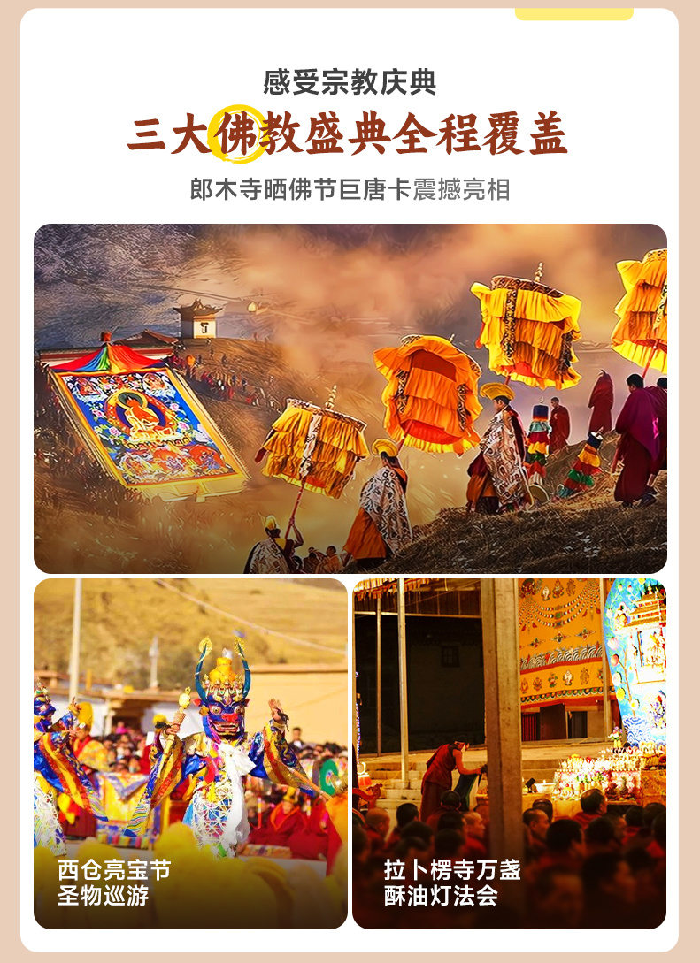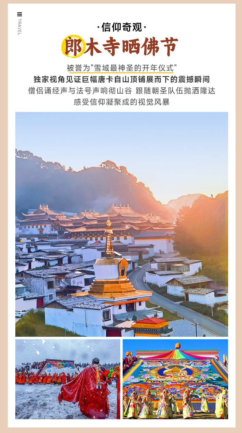 早餐后,我们从酒店集合出发,步行前往【赛赤寺(晒佛节)】(行程约:1KM,步行约 15 分钟,游玩约 3 小时)。冬季晒佛节格外热闹,寺外雪地早挤满裹厚藏袍的信徒,喇嘛们抬着巨大的红布佛像沿坡而上,佛像在白雪映衬下格外醒目。寒风里,经幡猎猎作响,信徒们手转经筒、煨桑祈福,桑烟混着雪粒飘向天空,佛像展开后,众人俯身叩拜,场面庄重又温暖。