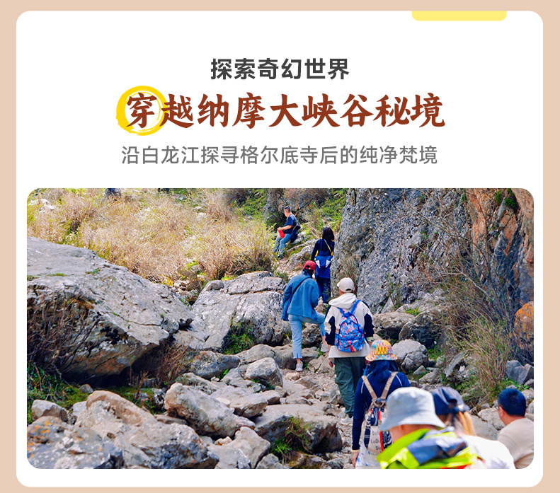 之后前往【纳摩大峡谷】峡谷入口经幡飘着,栈道铺了层薄雪要慢慢走,白龙江源头的溪水冻成了冰,岸边灌木挂着雾凇,往深处走更静,只能听见踩雪的咯吱声,空气冷得很清新。