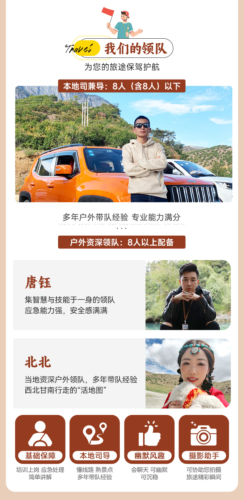 领队:8人拼车小团和2-8人小包团:提供司兼导,提供向导、代办住宿等服务;无法像专业领队一样提供讲解、景区伴游等服务!