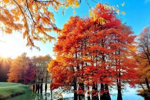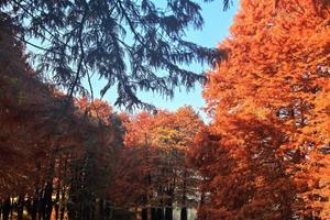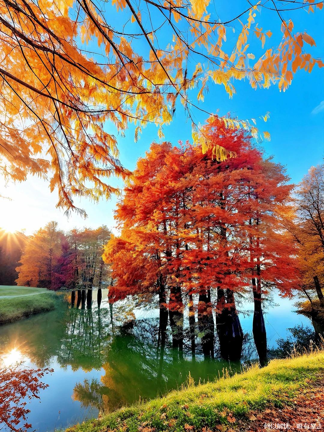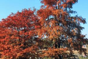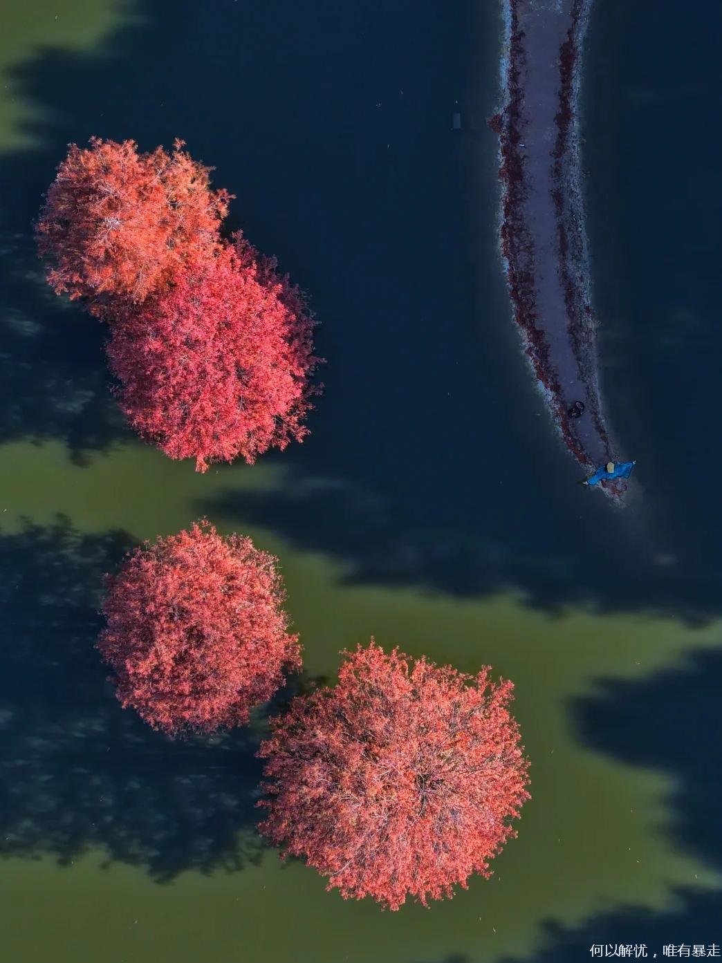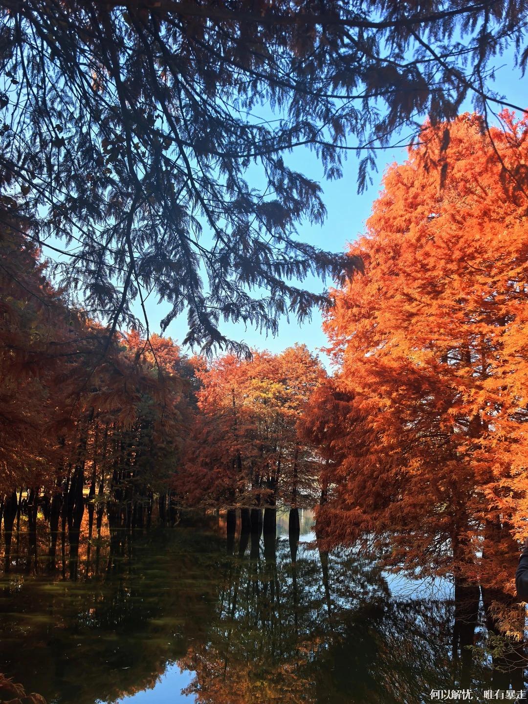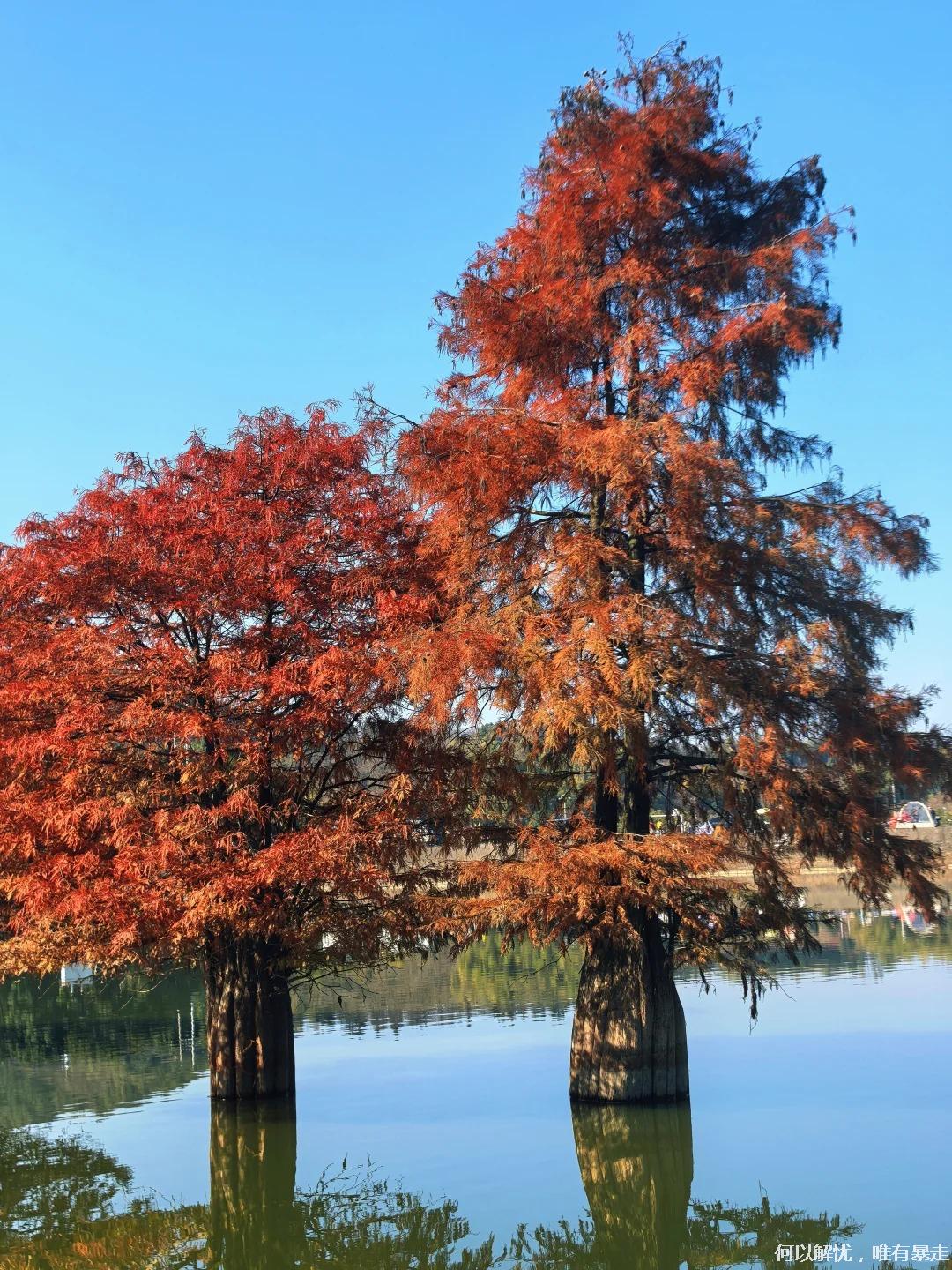 13:00左右,在领队带领下,乘车约半小时抵达麻岙水库。秋末冬初,和风舒畅,水杉林正染上金黄与火红。水库中央延伸出一道月亮弯状的走道,四周环绕着游览木栈道,可漫步其间,沉浸于斑斓秋色。