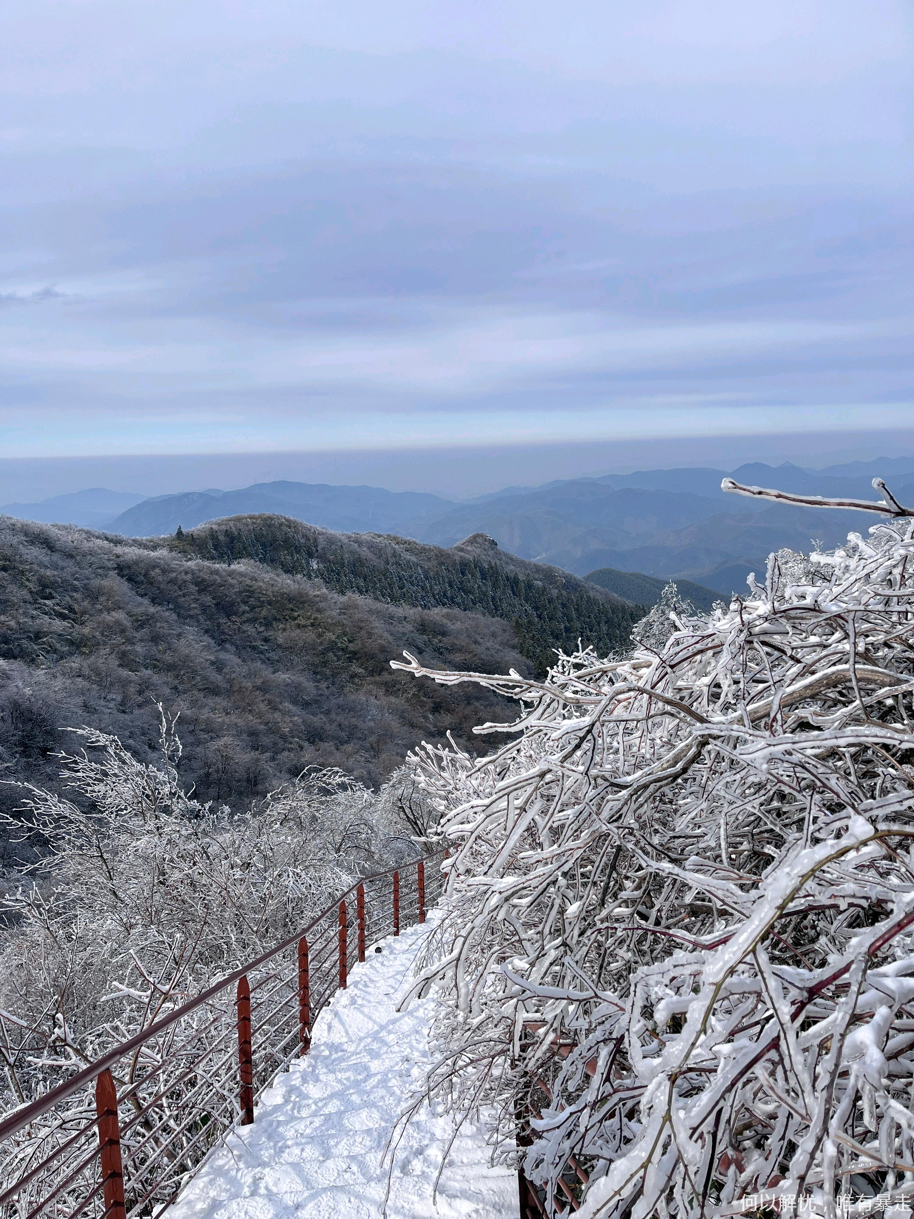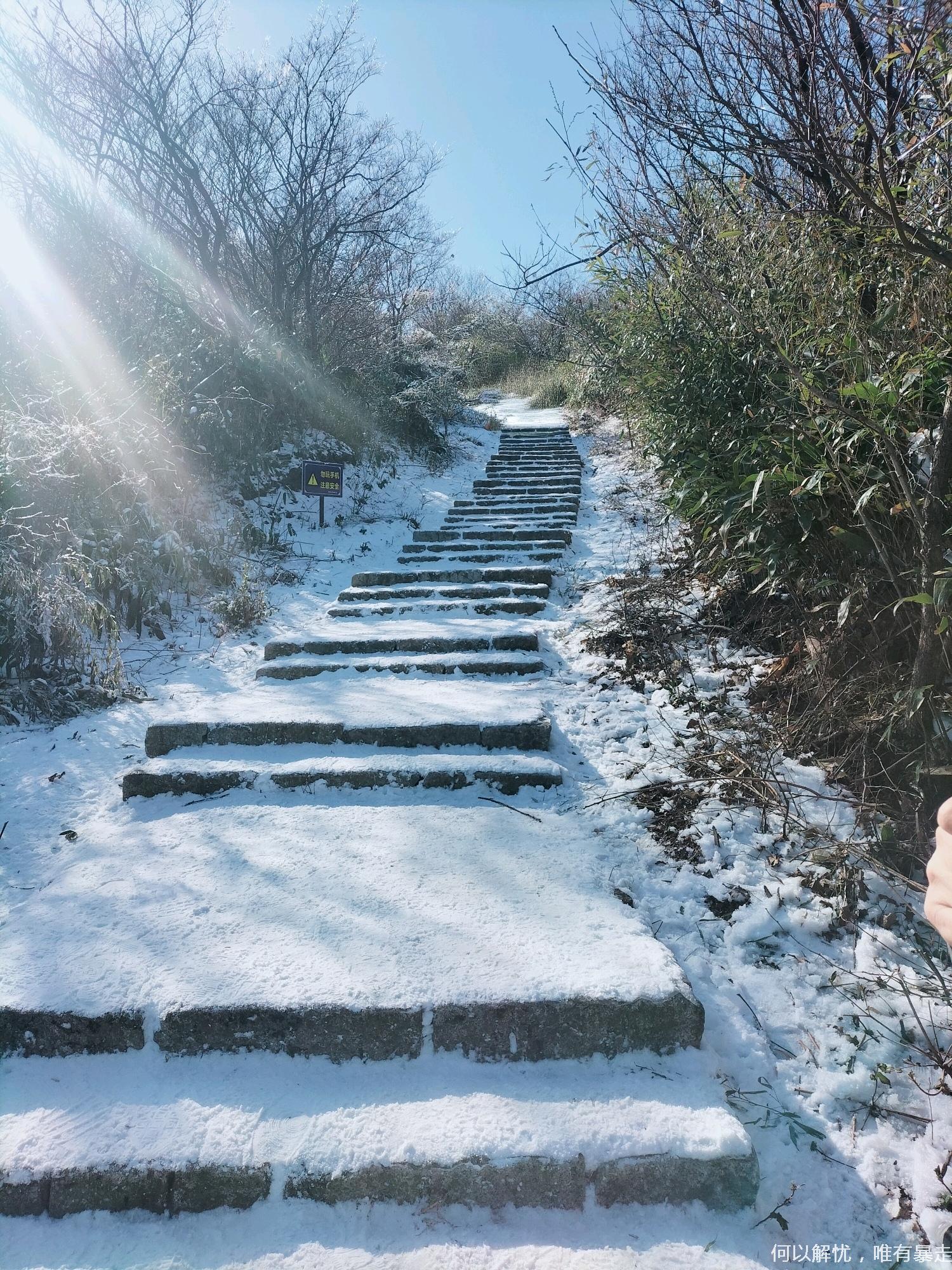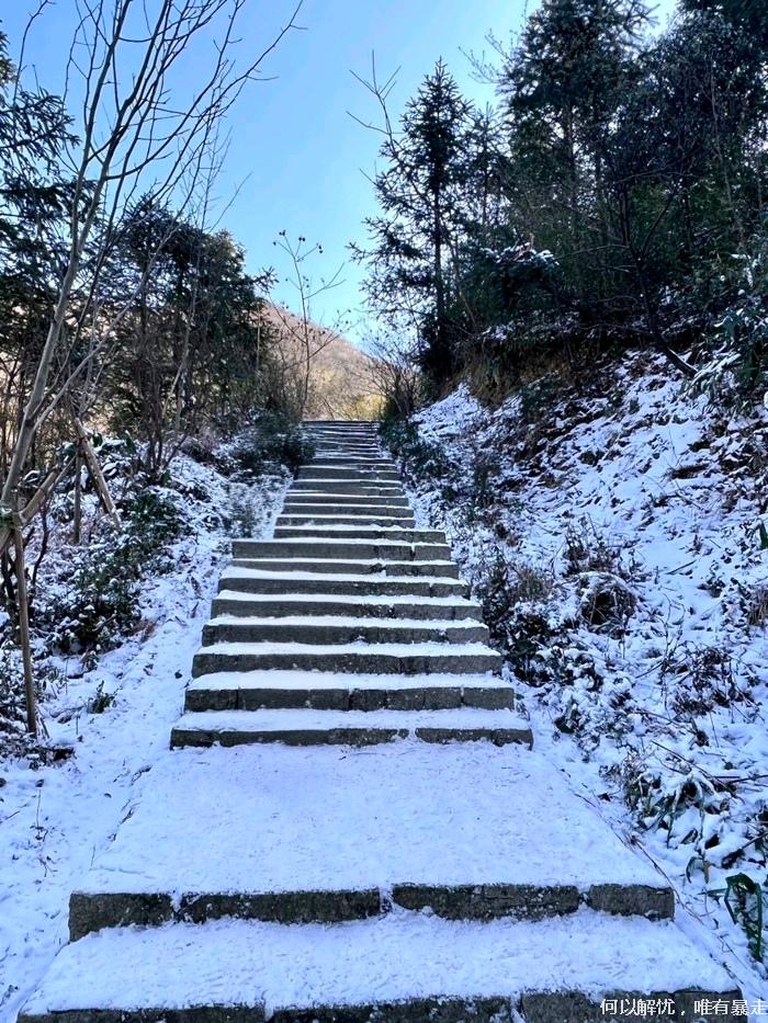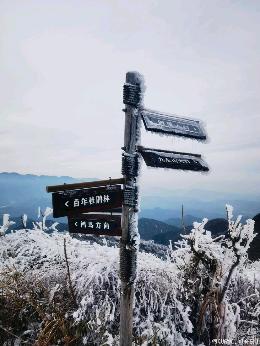11:00左右,抵达泗溪村,整队出发。此路线垂直爬升约750米,随海拔变化,植被从竹林渐变为杉木林、灌木丛,直至高山草甸,野趣盎然。冰雪覆盖的鸬鸟山犹如童话世界,竹林积雪,草甸凝冰,勾勒出江南雪景的独特诗意。
