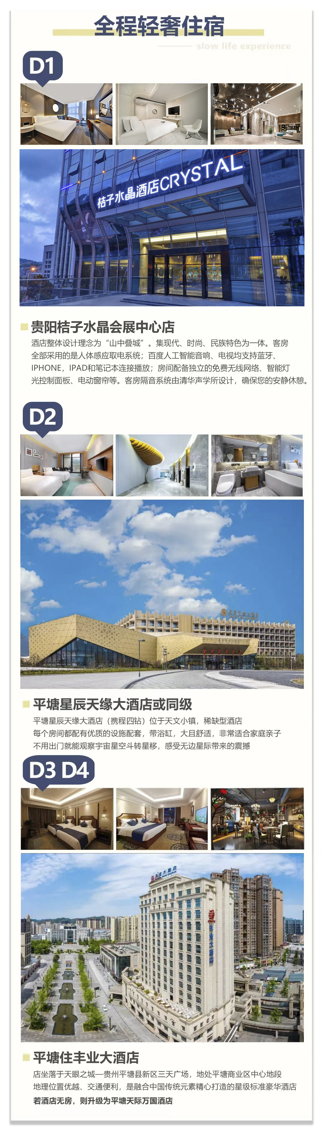6、贵州部分酒店标准相比内地偏低,如遇旺季酒店客房紧张或政府临时征用等特殊情况,我社有权调整为同等级标准酒店,全程不提供自然单间,单房差或加床费用须自理;酒店限AM12:00时退房,晚航班返程者,建议行李寄存酒店前台,自由活动或自费钟点房休息。