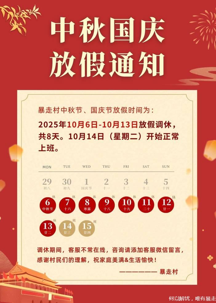 暴走村国庆中秋放假通知!10.6-13日客服休息,咨询请留言噢! [复制链接]