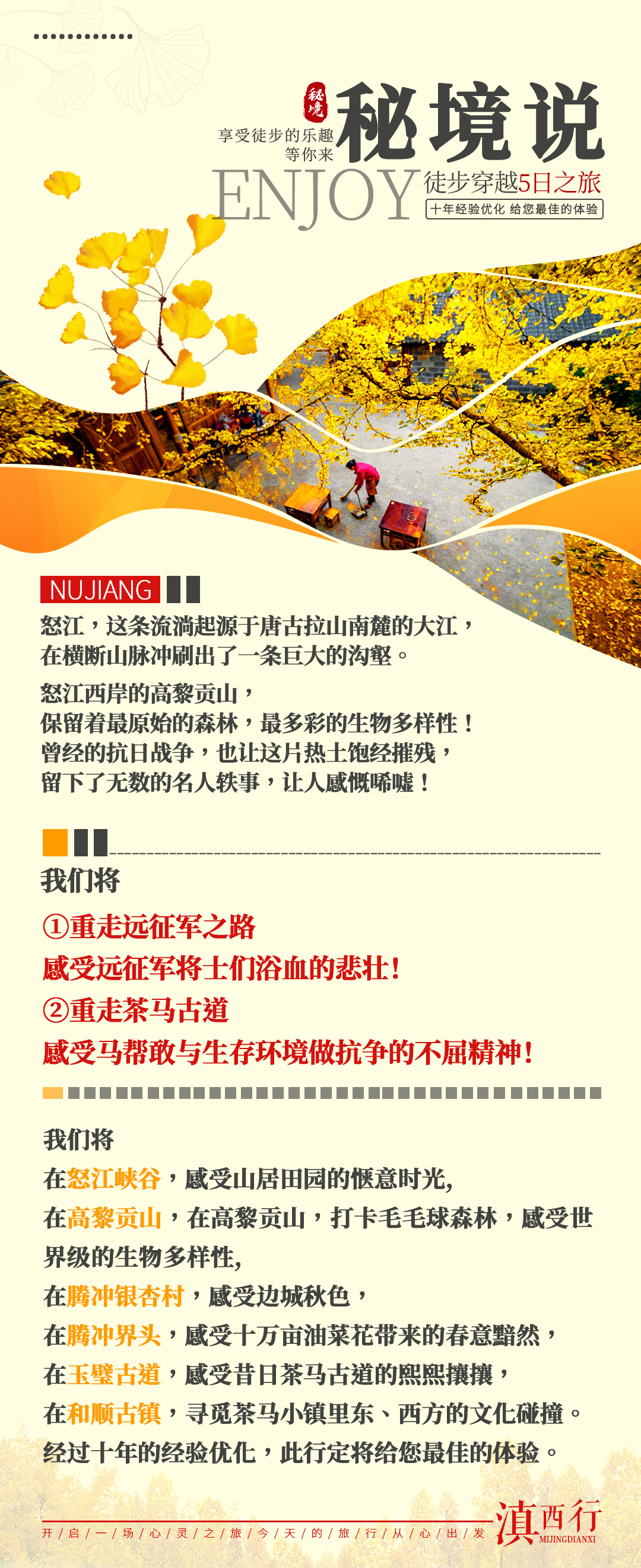 1、银杏观赏季为11月-12月;油菜花观赏季为2月-3月;在非观赏季节,我们将调整行程为拜访【滇西抗战纪念馆】,听远征军抗战的历史,回首往昔的峥嵘岁月。