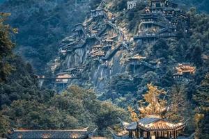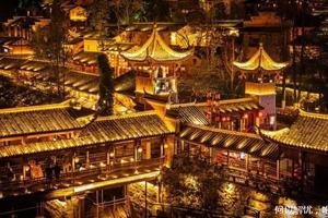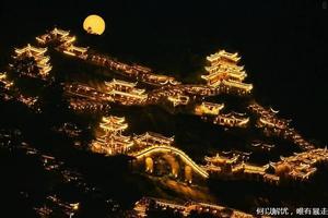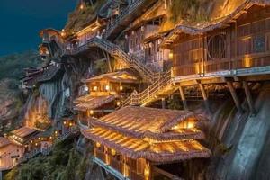奇幻景观:古镇建筑依悬崖而建,夜晚灯光亮起时宛如梦幻仙侠世界,极具视觉冲击力和拍照吸引力。