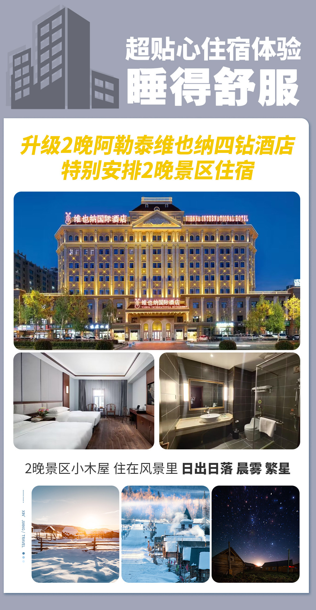3.到达阿勒泰后自行前往指定酒店入住,办理入住时需要交押金,房费已付,押金自理,报邂逅新疆+姓名拿房卡。
