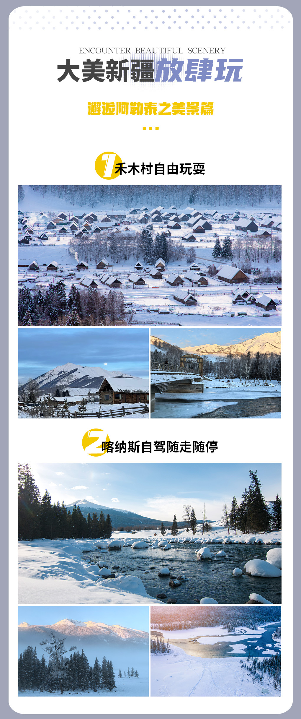 今日前往【禾木景区】你会发现这里才是你真正想找的童话雪景世界。整个村子银装素裹,可以骑马闲逛,坐一坐雪地秋千,雪地摩托、马拉爬犁、打雪仗、堆雪人、跳雪、泼水成冰...今日畅游在禾木村,晒着冬日暖阳,享受无比清新的空气。随处可见的雪蘑菇,随手一拍即是大片!还能观赏最美落日和银河星空。