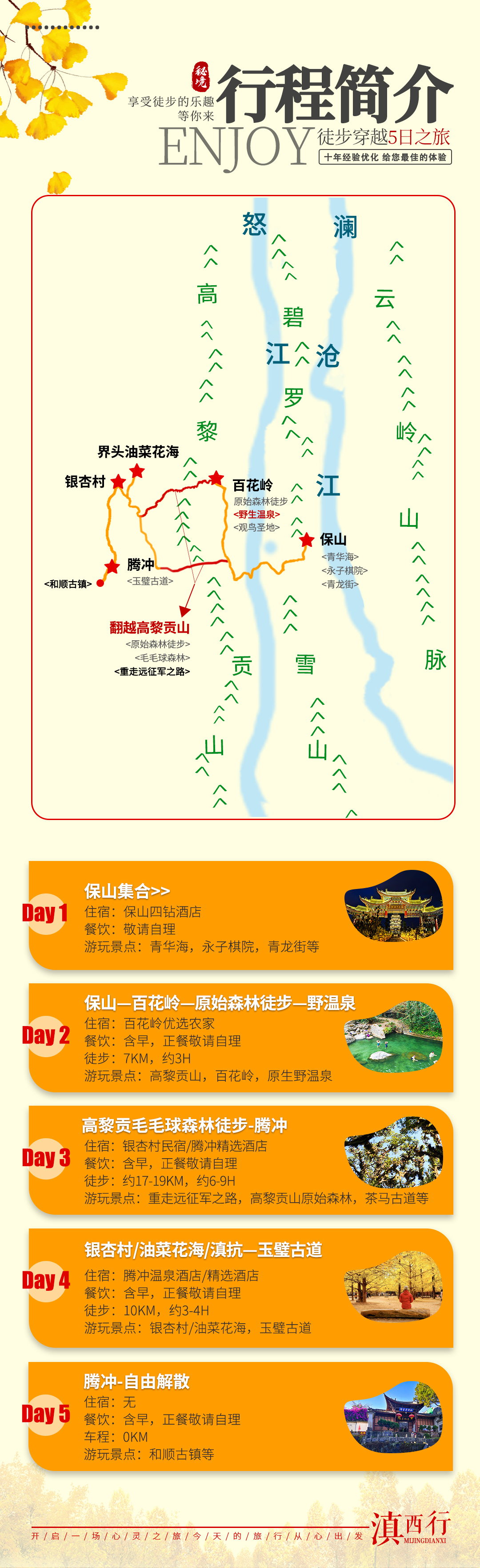 1、银杏观赏季为11月-12月;油菜花观赏季为2月-3月;在非观赏季节,我们将调整行程为拜访【滇西抗战纪念馆】,听远征军抗战的历史,回首往昔的峥嵘岁月。