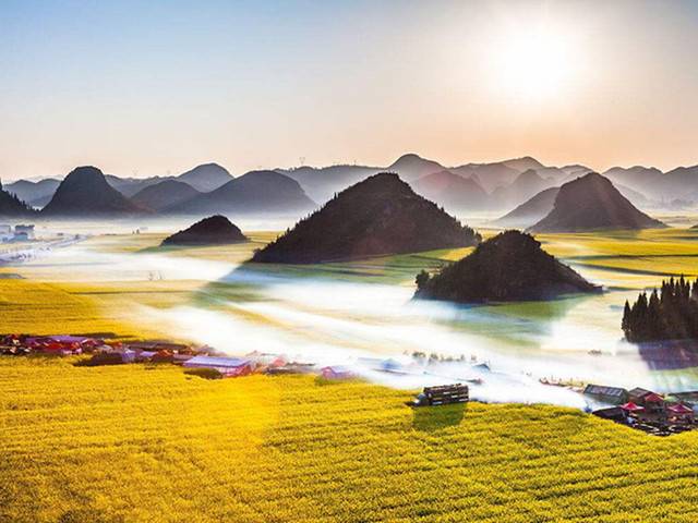 之后前往罗平【金鸡峰从】,此处地方比较灵活,大家可以分开游玩摄影,也可以穿上我们准备的古装,来一组美美的花田服装美照。金鸡峰可以在山头上拍摄,山不高,天气好可以拍摄到耶稣光射到云雾中若隐若现的油菜花以及金鸡峰群中。