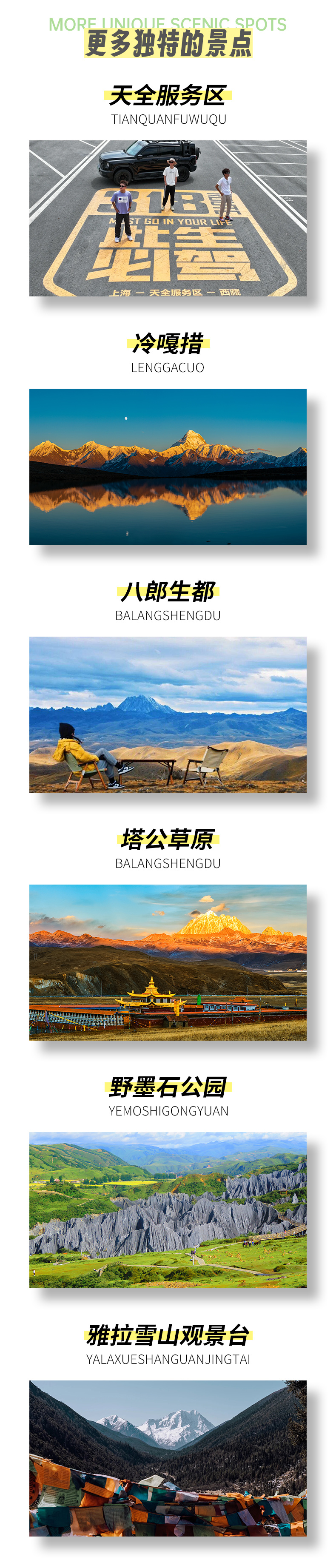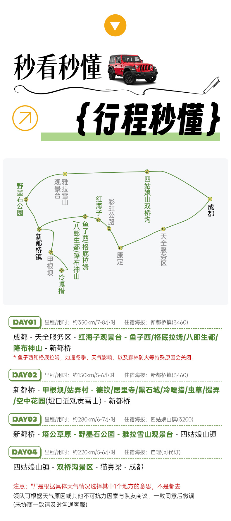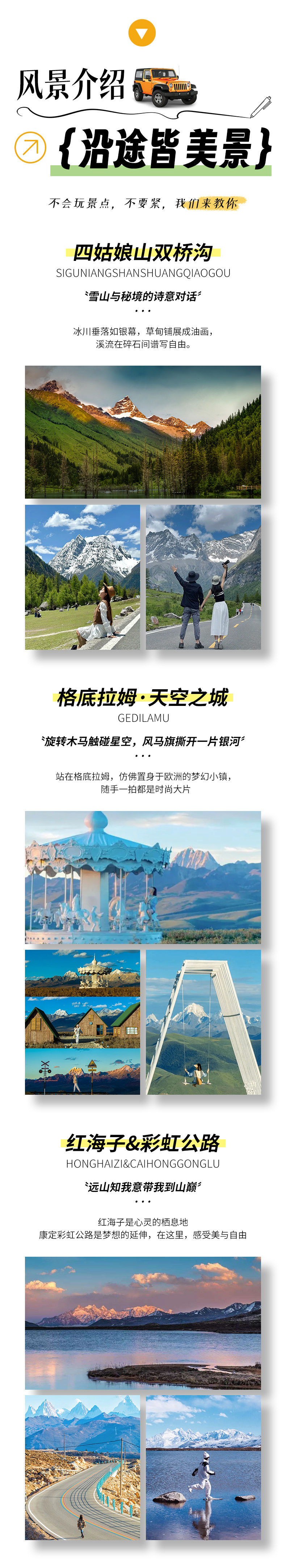 景点海拔:天全服务区(680)、红海子观景台(4100)、鱼子西/格底拉姆/八郎生都/降布神山(4200)