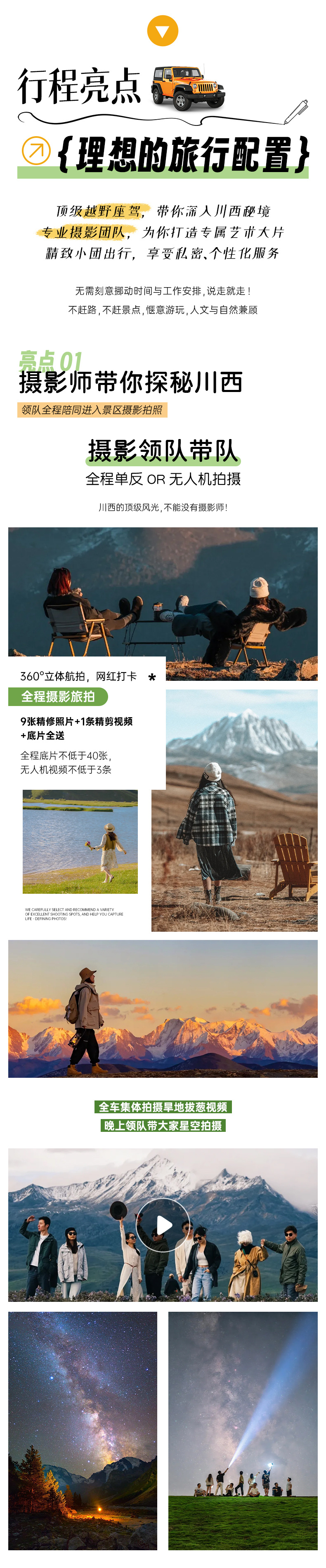 无人机+单反旅拍(底片全送+9张精修照片+1条精剪视频),底片全程不低于40张,无人机视频不低于3条(全车人拍摄旱地拔葱视频,晚上领队带大家星空拍摄);