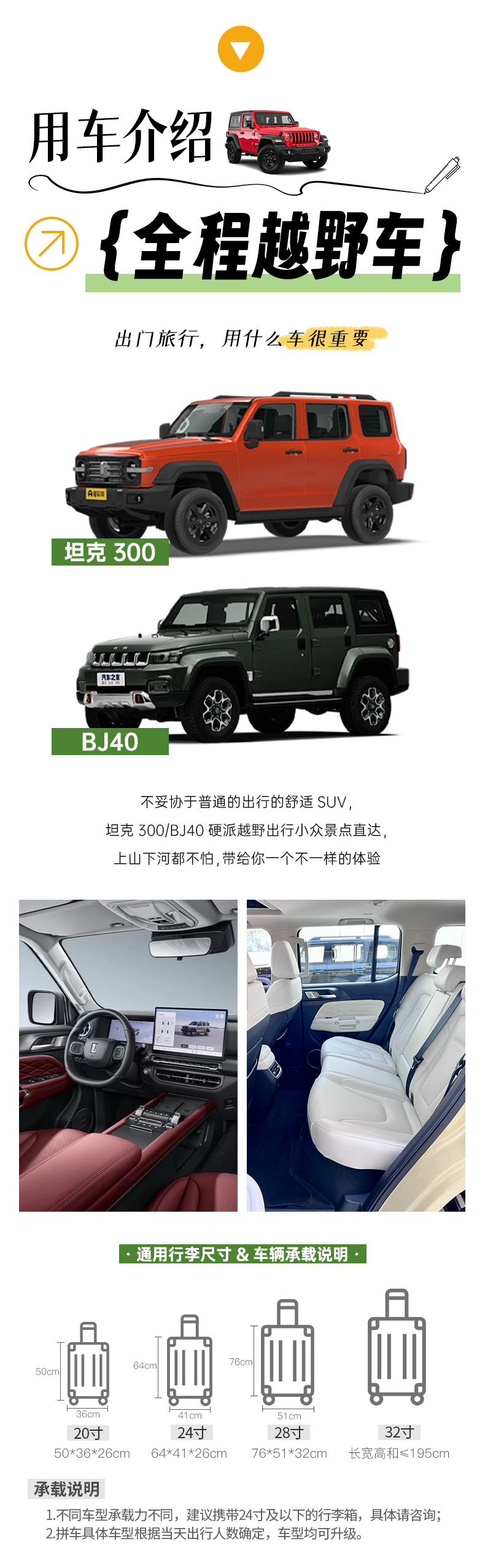 备注:车型承载力有限,携带行李为24寸或以下行李箱。