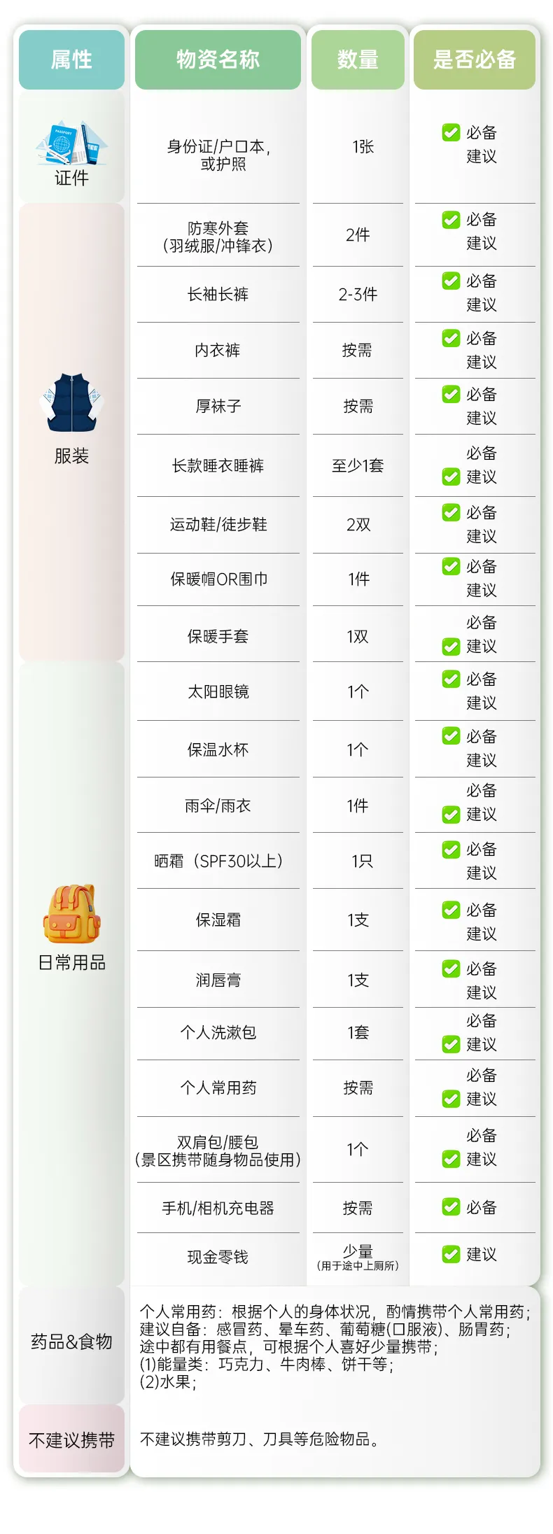 川西高原气候多变,昼夜温差大,紫外线强,请大家务必注意防寒与防晒,春夏季节出行,参考以下物品准备行李: