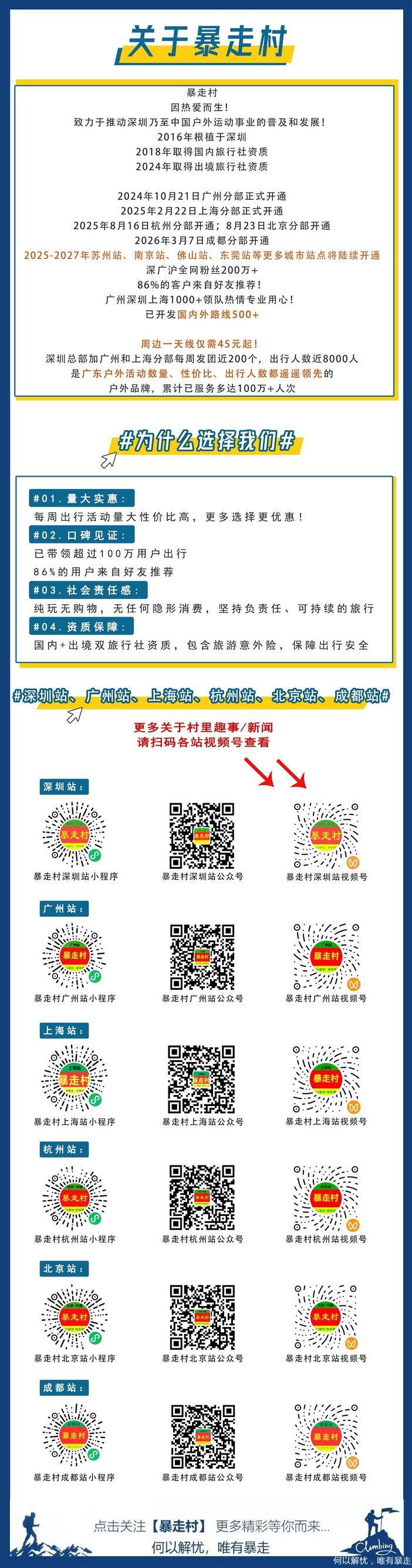 天气变幻莫测,预报准确率低,而活动出行需提前安排。一般而言:小雨阵雨出行,大雨暴雨及以上则取消或延迟。如遇不能出行的天气或者活动有改动,请随时关注活动群通知,最终解释权归暴走村所有。