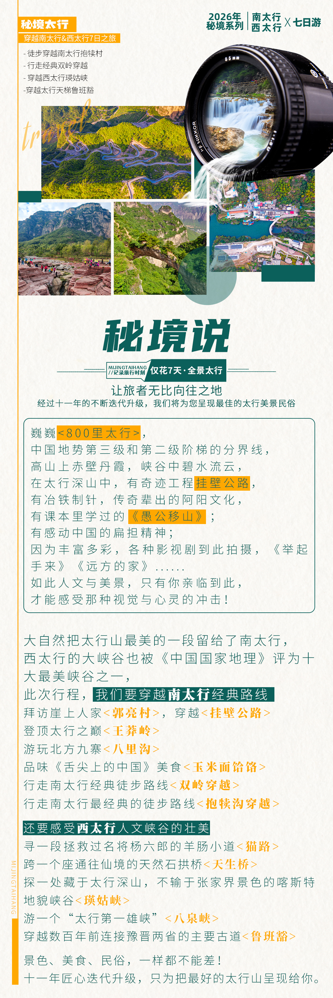 今天可以早早起床,感受清晨【八里沟】的“太行之魂、中华风骨”的魅力,也可以睡个懒觉。早餐后,大家顺沟而出。一路上,登红岩绝壁,赏峡谷云海,望流泉飞瀑,闻老子布道,更有“仙人迎客峰”欢迎您的到来!山青水秀、碧水丹崖,不愧是号称“北方小九寨”!