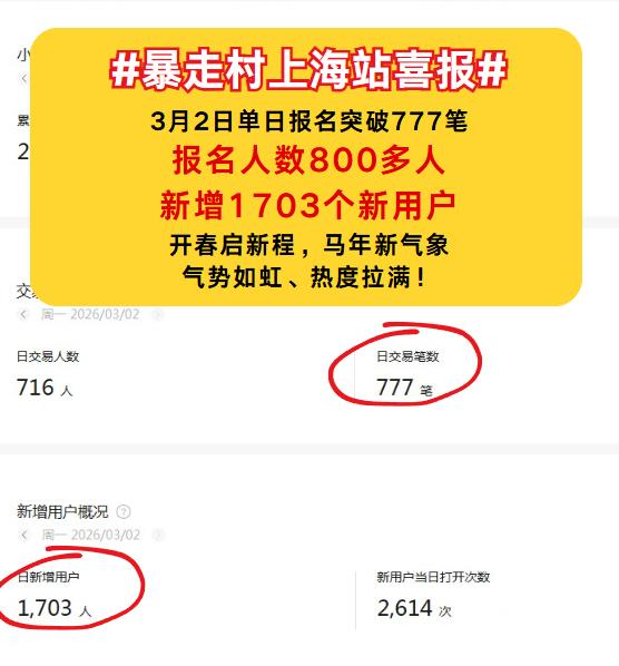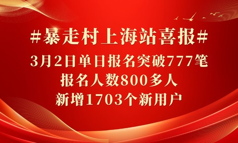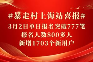 暴走村上海站喜报!单日报名突破777笔 报名人数800多人! 新增1703位新用户! [复制链接]