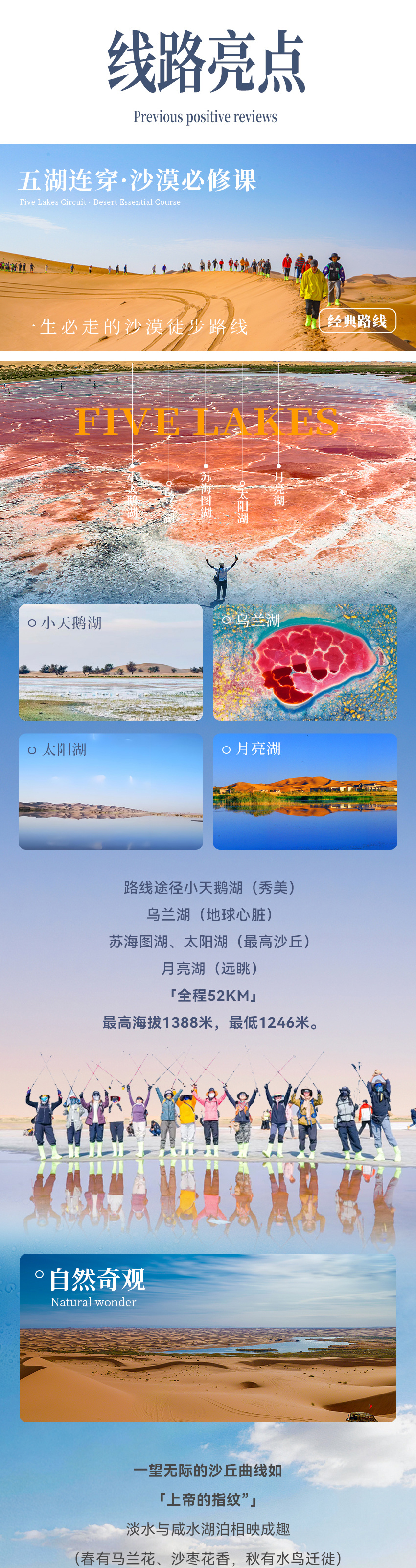 今日沿途可远眺月亮湖(不进入湖内),碧绿湖水、漫漫黄沙、蔚蓝天空在这里交织成一个美妙的画卷,继续行走10公里到达终点! 领队在终点为大家颁发奖牌,集沙瓶,合影留念;午餐过后,大家一起返回银川解散。