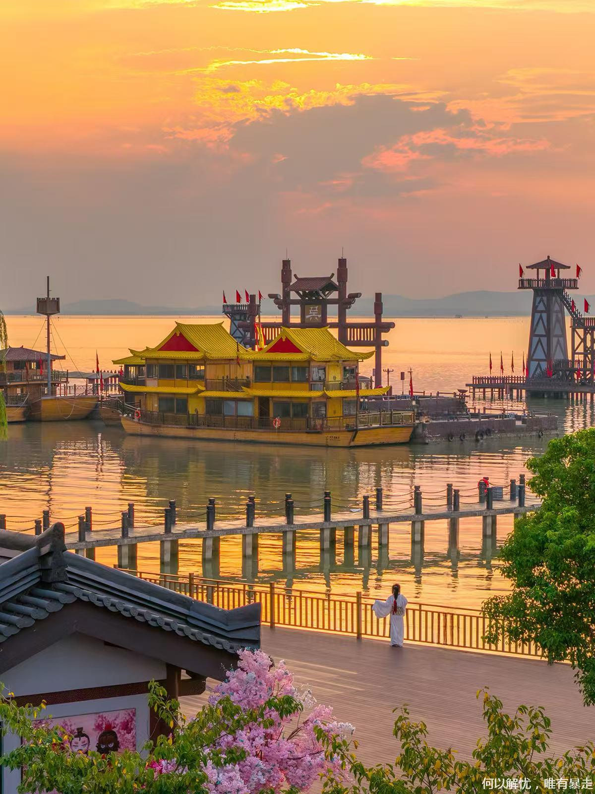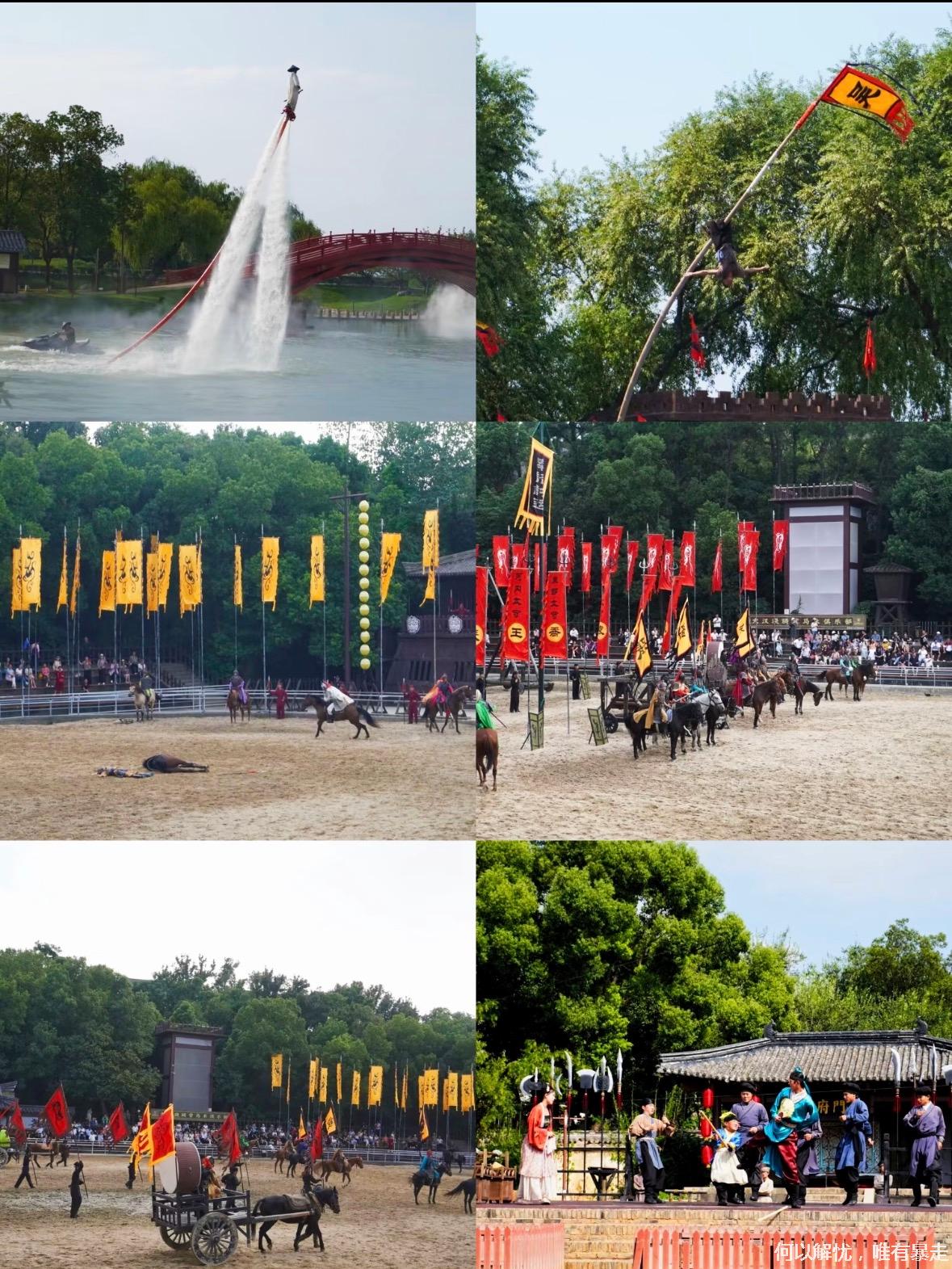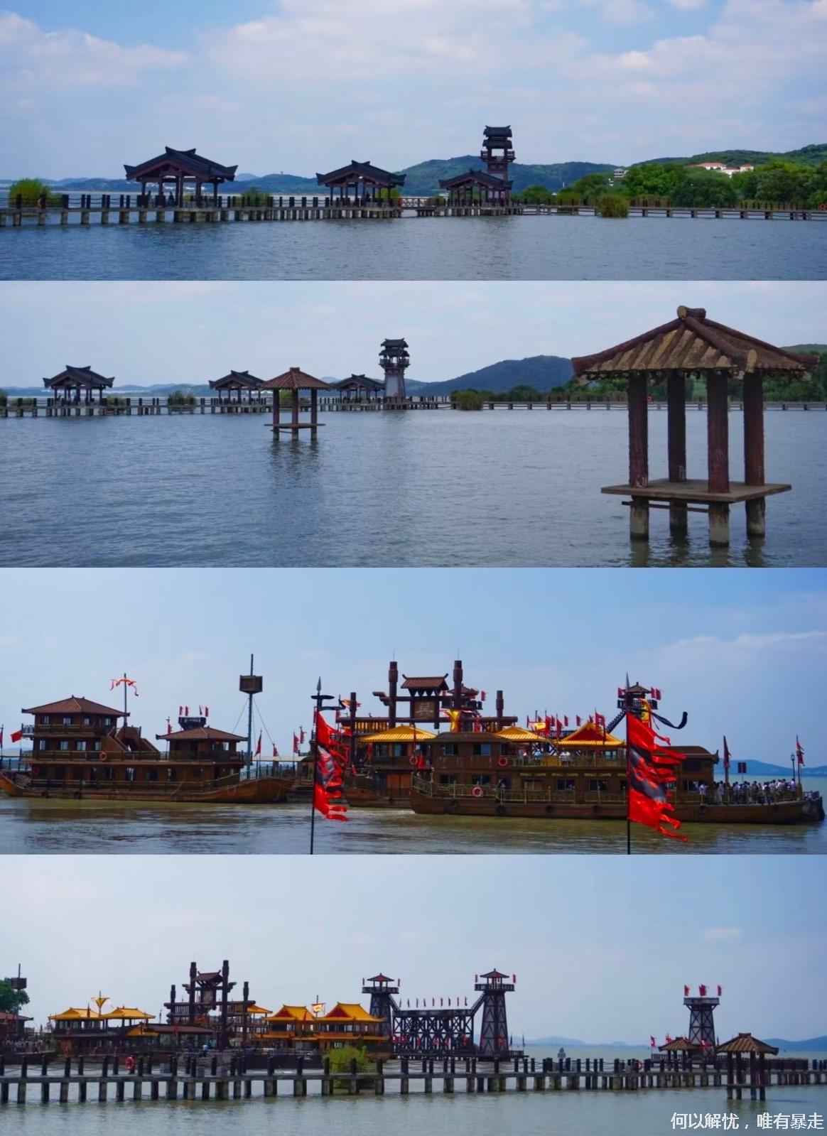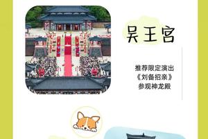 城门广场(推荐合影留念)一汉鼎广场一>桃园一跑马场(推荐演出《三英战吕布》)一樱花园(推荐春日赏樱)一曹操点将台曹操楼船(参观《三曹文学展》)一>吴营水寨(乘坐古船赏太湖风光、冬季可投喂红嘴鸥)一吴王宫(推荐限定演出《刘备招亲》)一聚贤堂(推荐舞台剧《洛神赋图》)>香宁宫(推荐夏日赏荷)一孙尚香酒家(品尝三国特色美食)一卧龙岗一甘露寺三国水浒打卡墙(推荐拍照)汉宋门